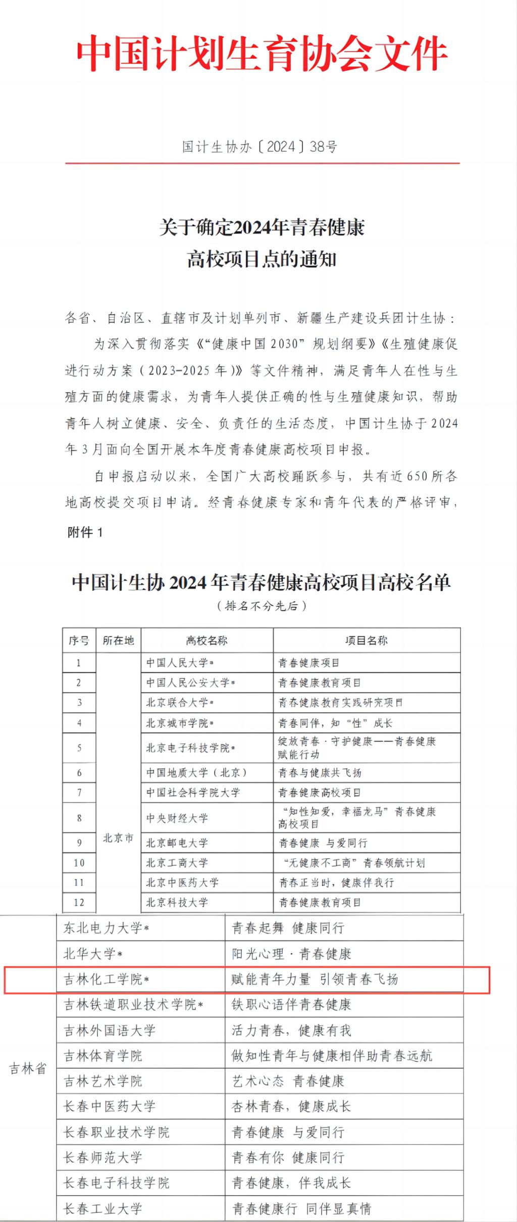 近日,中国计生协发布了2024年青春健康高校项目中标高校名单,我校心理健康咨询中心申报的“赋能青年力量 引领青春飞扬”项目中标,获得中国计生协批复。