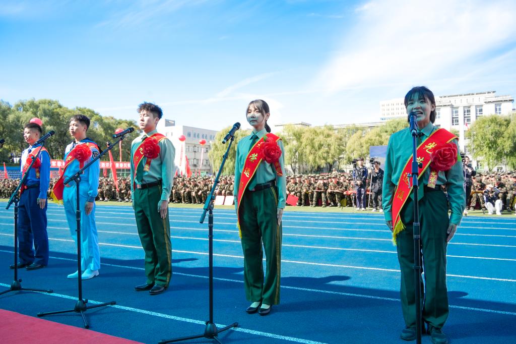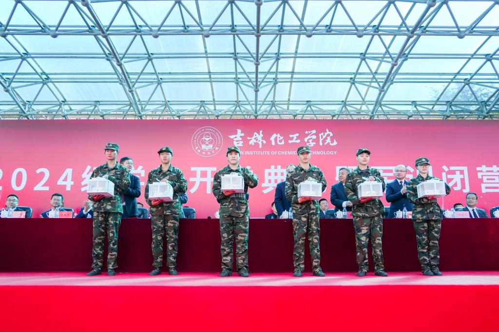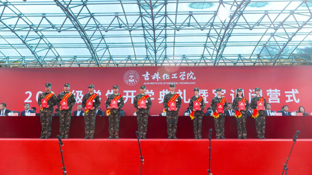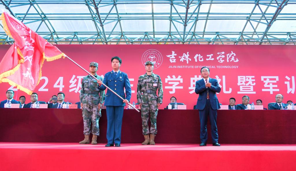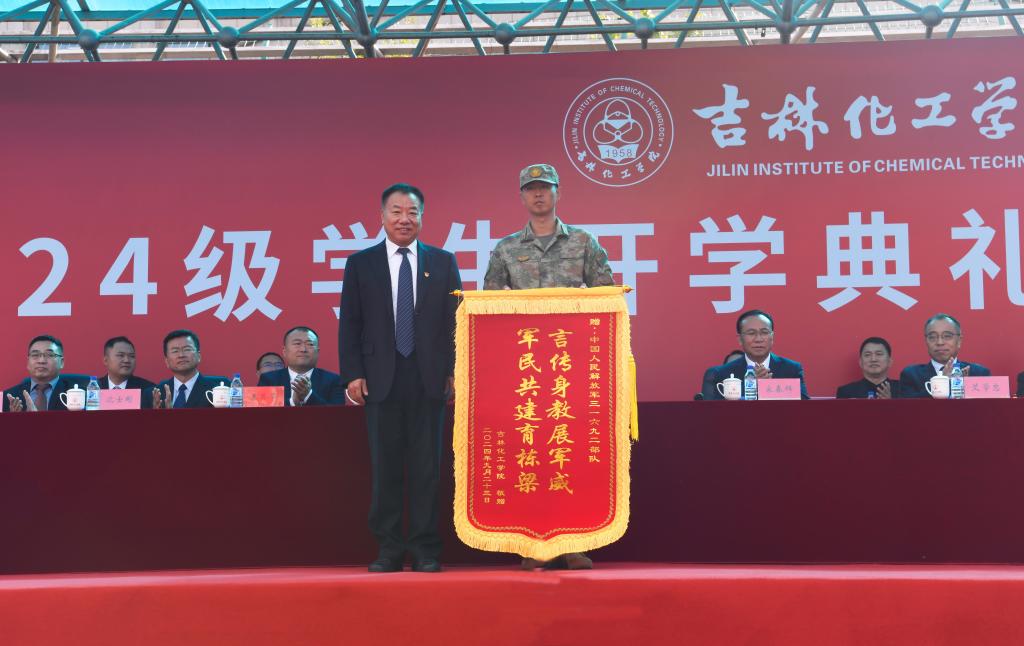 党委副书记蔡立峰宣读《关于表彰2024级学生军训先进集体和先进个人的决定》;党委副书记李士阳向承训部队——中国人民解放军31692部队赠送锦旗;党委常委、副校长孙大志宣读《关于组建吉林化工学院大学生预备连的通知》。