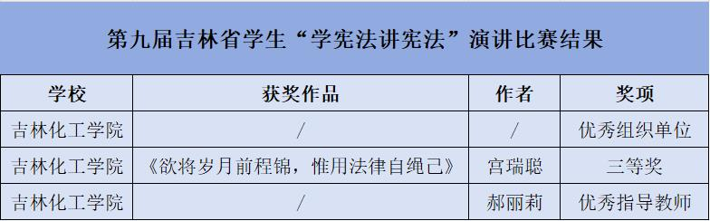 近日,吉林省教育厅发布了《第九届吉林省学生“学宪法讲宪法”演讲比赛结果的通知》。在全省参赛的百余所大中小学校中,我校荣获“优秀组织单位”,参赛学生荣获“三等奖”,1名教师荣获“优秀指导教师”。