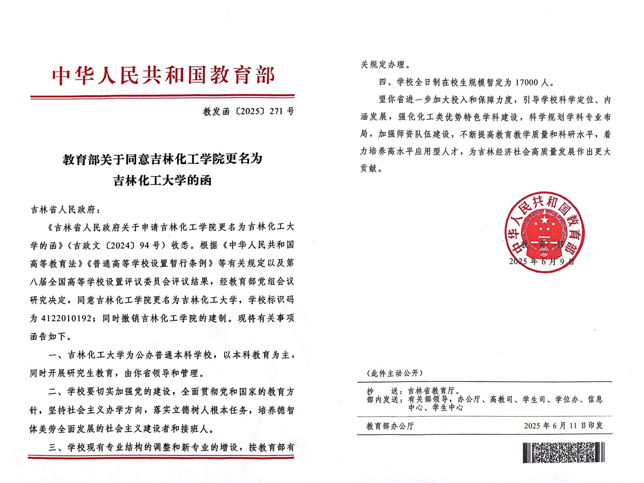 函件中说,吉林化工大学为公办普通本科学校,以本科教育为主,同时开展研究生教育。学校全日制在校生规模暂定为17000人,现有专业结构的调整和新专业的增设,按教育部有关规定办理。