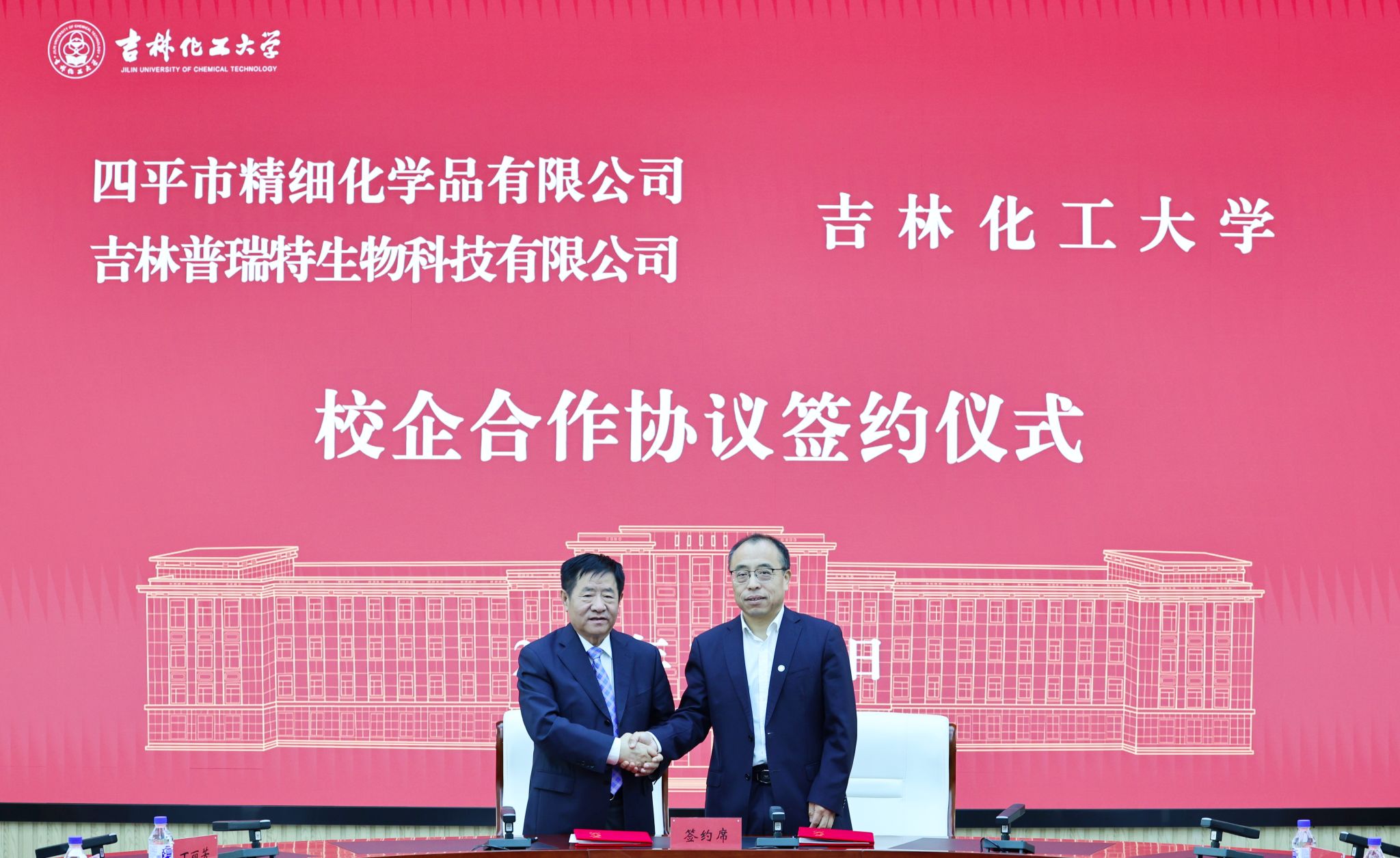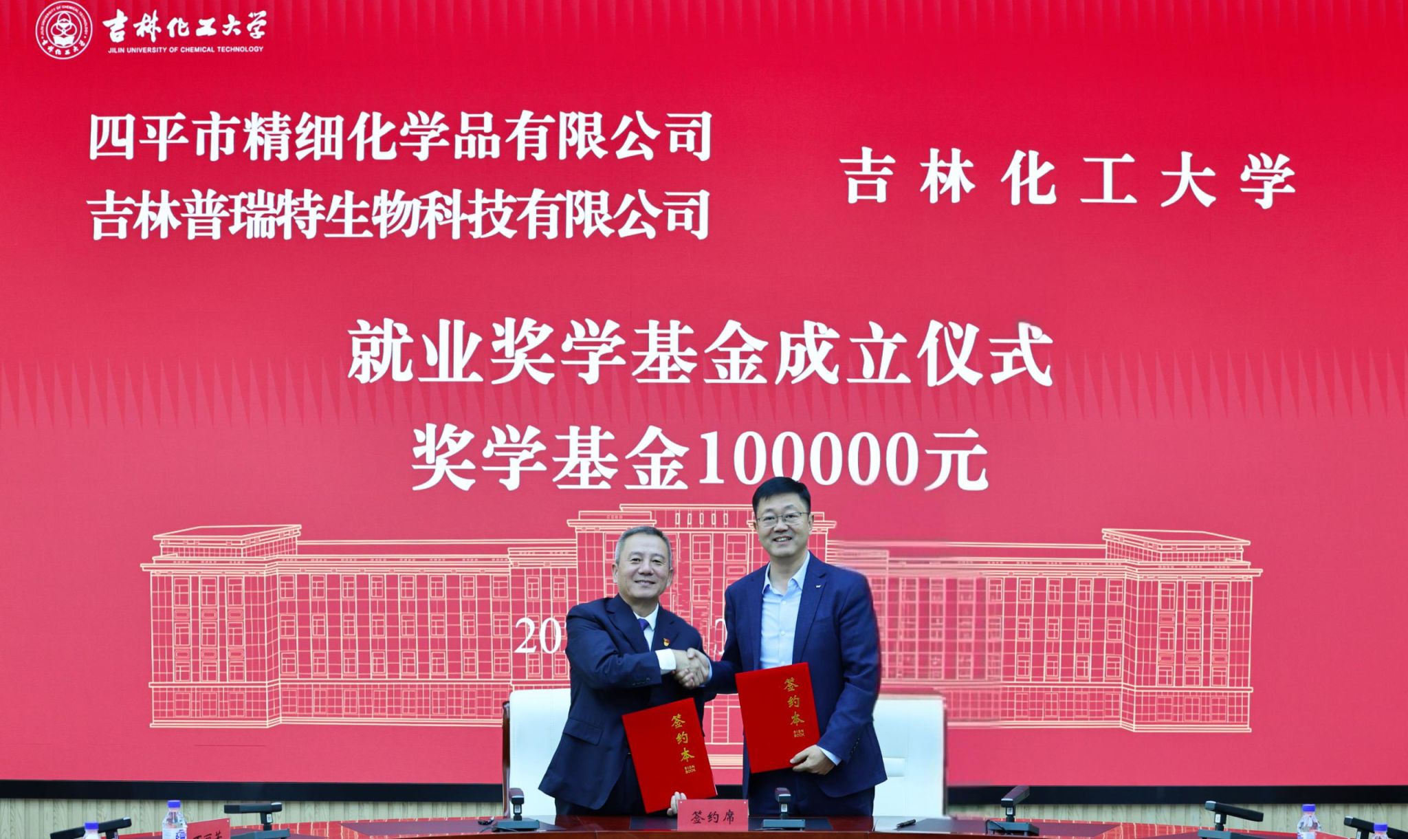 10月11日,吉林化工大学与四平市精细化学品有限公司、吉林普瑞特生物科技有限公司校企合作协议签约暨就业奖学基金成立仪式在学校举行。吉林化工大学校长艾学忠,四平市精细化学品有限公司董事长薛亮出席活动。