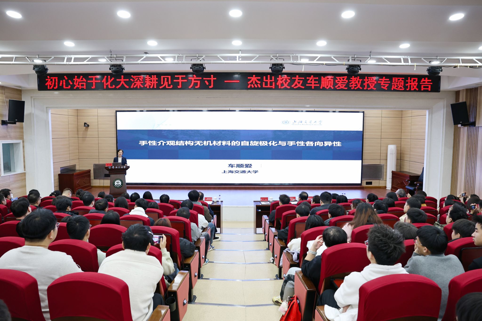 报告中,车顺爱教授以深入浅出的语言,引领师生走进微观“手性”世界的奇妙图景;并系统阐释了“手性诱导自旋选择性效应(CISS效应)”的基本原理;同时结合自身科研成果与国际前沿案例,生动展示了手性材料研究的发展脉络与未来趋势。