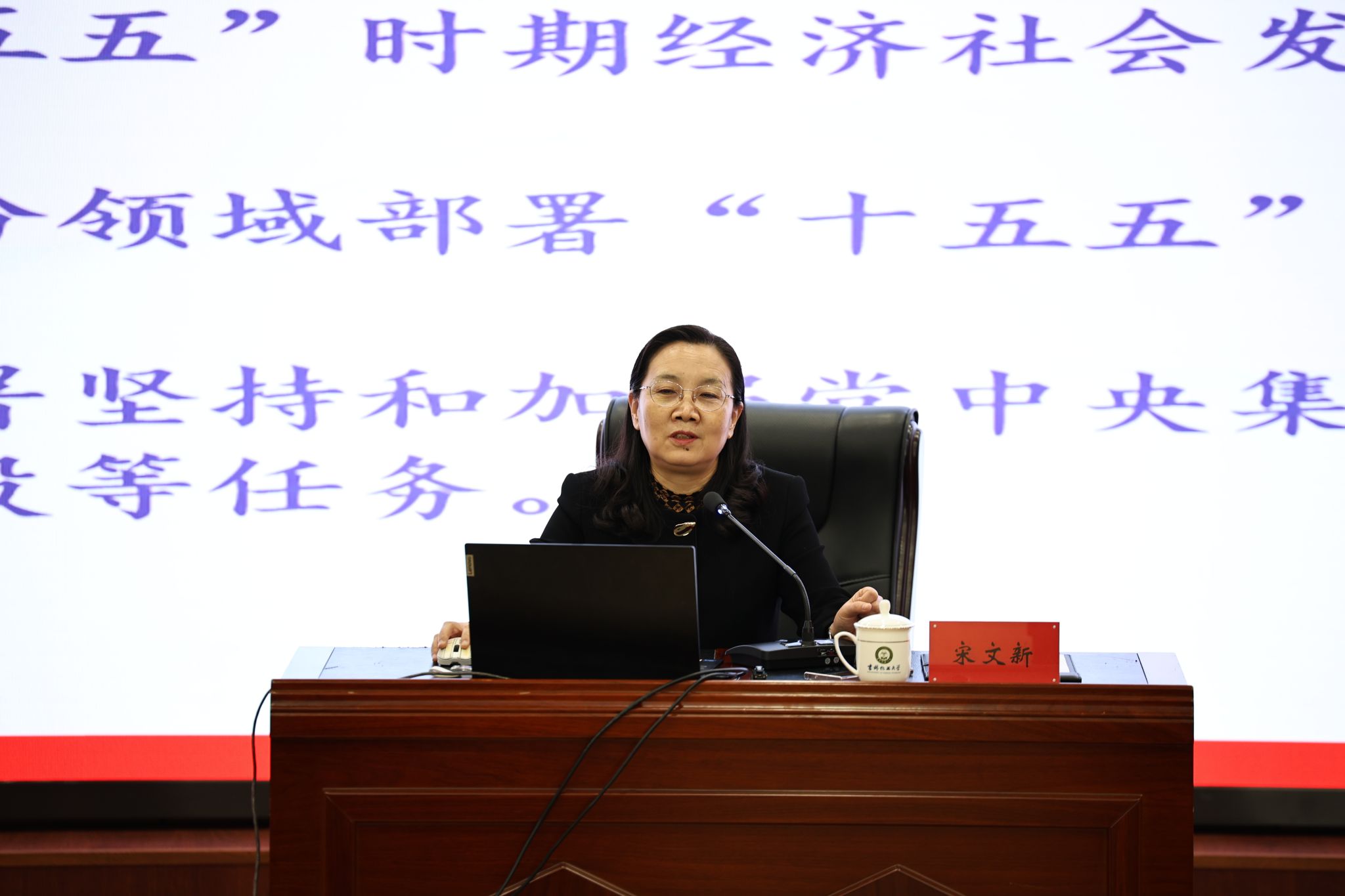 宋文新以“在接续奋进中谱写中国式现代化新篇章”为题,从改革开放以来我国社会主义现代化建设的时间表和路线图、“十四五”时期我国发展取得的重大成就、“十五五”时期经济社会发展的重大意义和总体要求、“十五五”时期的战略任务和重大举措、坚持和加强党的全面领导五个方面,详细解读党的二十届四中全会精神。