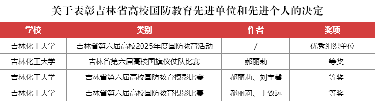 近日,吉林省高等教育学会、国防教育专业委员会公布了《关于表彰吉林省高校国防教育先进单位和先进个人的决定》,学校获评“吉林省第六届高校2025年度国防教育活动优秀组织单位”,学生国旗仪仗队获评吉林省第六届高校国旗仪仗队二等奖,两项作品分别获评吉林省第六届高校国防教育摄影比赛一等奖和三等奖。
