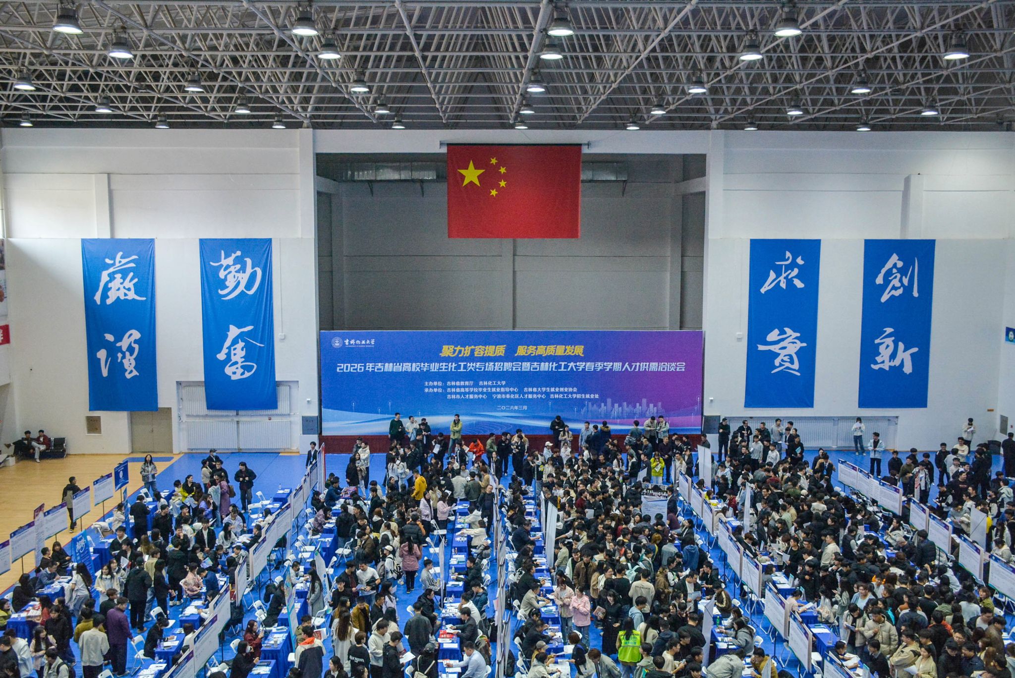 3月25日,吉林化工大学校园内春意盎然、人才荟萃,以“聚力扩容提质 服务高质量发展”为主题,2026年吉林省高校毕业生化工类专场招聘会暨吉林化工大学春季学期人才供需洽谈会在龙潭校区体育馆举行。学校党委常委、副校长孙大志出席活动,深入走访各企业展位,与用人单位代表广泛交流,详细了解企业人才需求及行业发展动态。