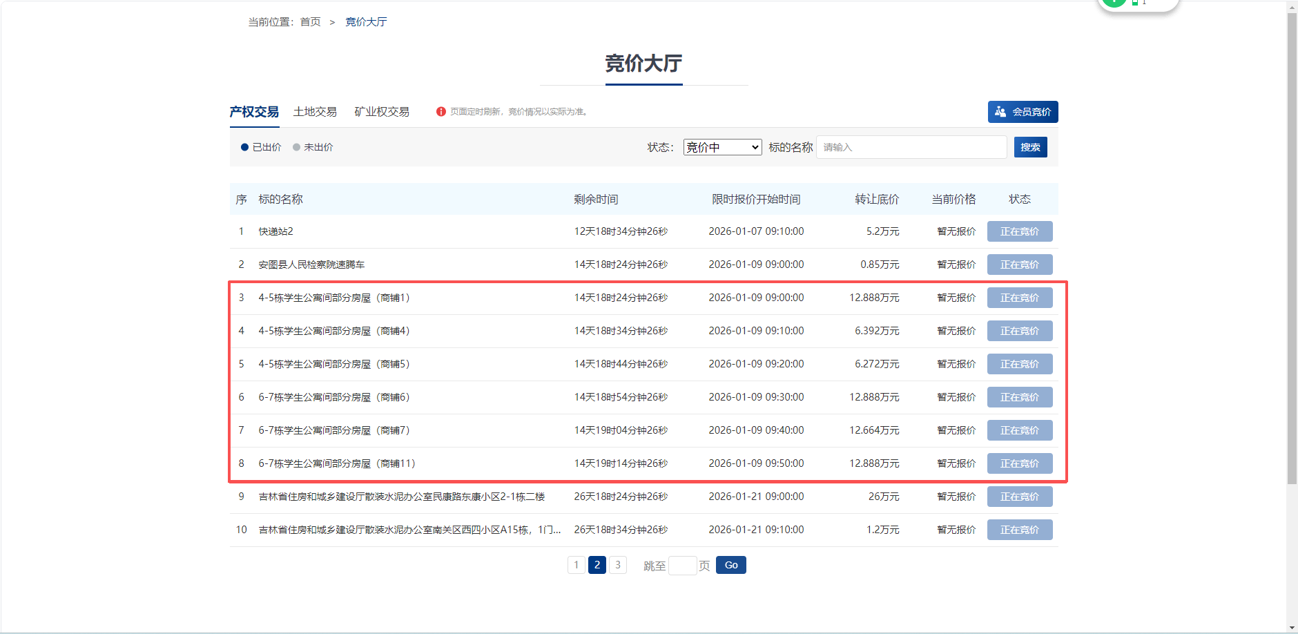 为满足学校师生日常生活需求,根据《省直行政事业单位非办公用房出租出借管理办法》(吉财国资〔2017〕888号)、《关于优化省级行政事业单位房屋土地资产管理机制的意见》(吉财资〔2024〕120号)文件规定,经学校党委常委会审议通过,我校拟对国有资产非办公用房进行公开招租。相关信息已于2025年6月19日至25日完成公示,并报请教育厅、财政厅批示。按照相关文件规定,因剩余6处商铺无单位、个人报名,导致三次流拍,现已向教育厅申请降价,并在吉林省公共资源交易中心官方网站发布剩余出租项目信息披露(第4次公告),出租项目信息详见网址链接:http://www.ggzyzx.jl.gov.cn/jyxx/cqjy/zrgg/202512/t20251222_3520657.html。挂牌价格(转让底价)以竞价大厅为准,意向单位、个人请查看下方截图: