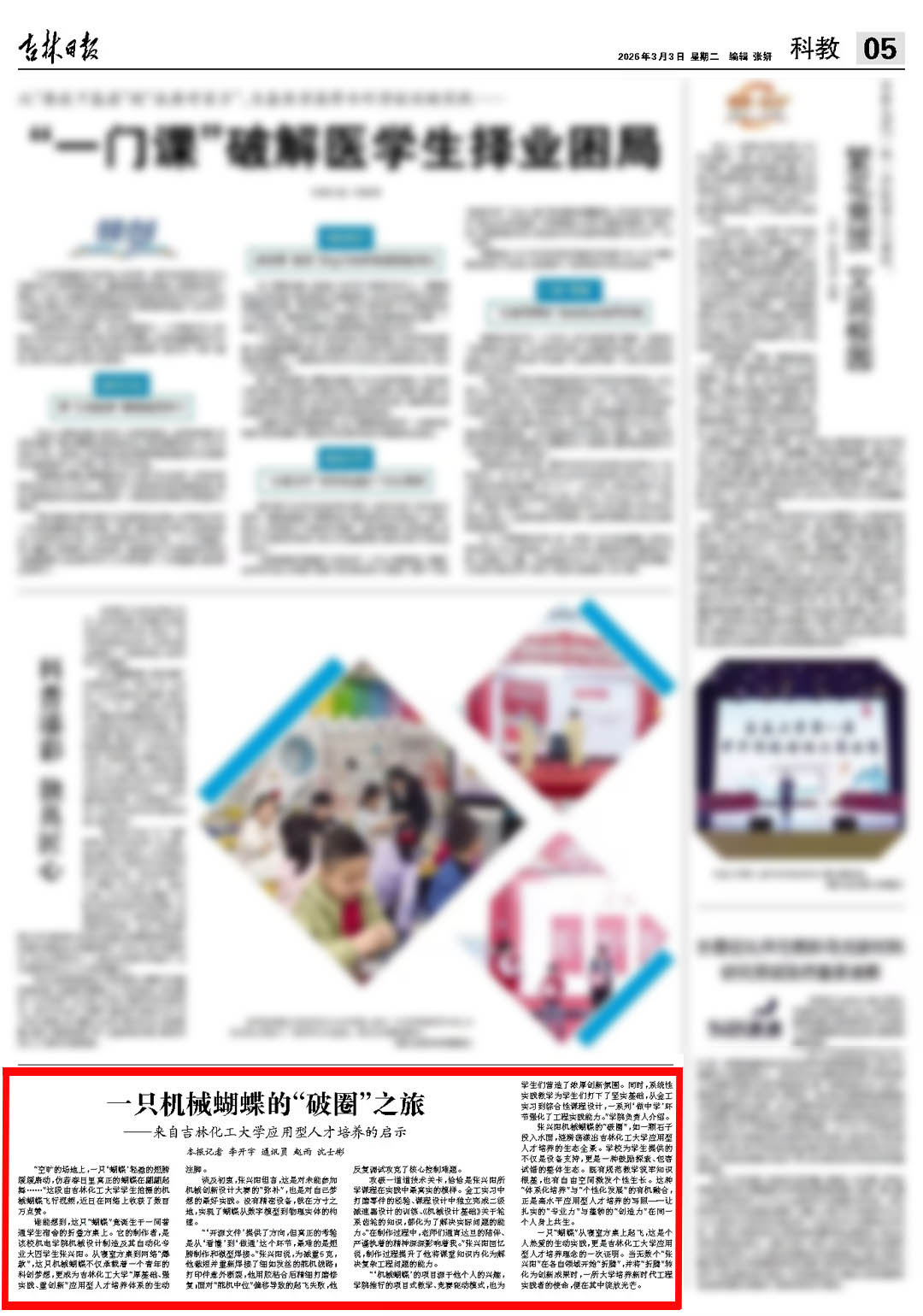 张兴阳机械蝴蝶的“破圈”,如一颗石子投入水面,涟漪荡漾出吉林化工大学应用型人才培养的生态全景。学校为学生提供的不仅是设备支持,更是一种鼓励探索、包容试错的整体生态。既有规范教学筑牢知识根基,也有自由空间激发个性生长。这种“体系化培养”与“个性化发展”的有机融合,正是高水平应用型人才培养的写照——让扎实的“专业力”与蓬勃的“创造力”在同一个人身上共生。